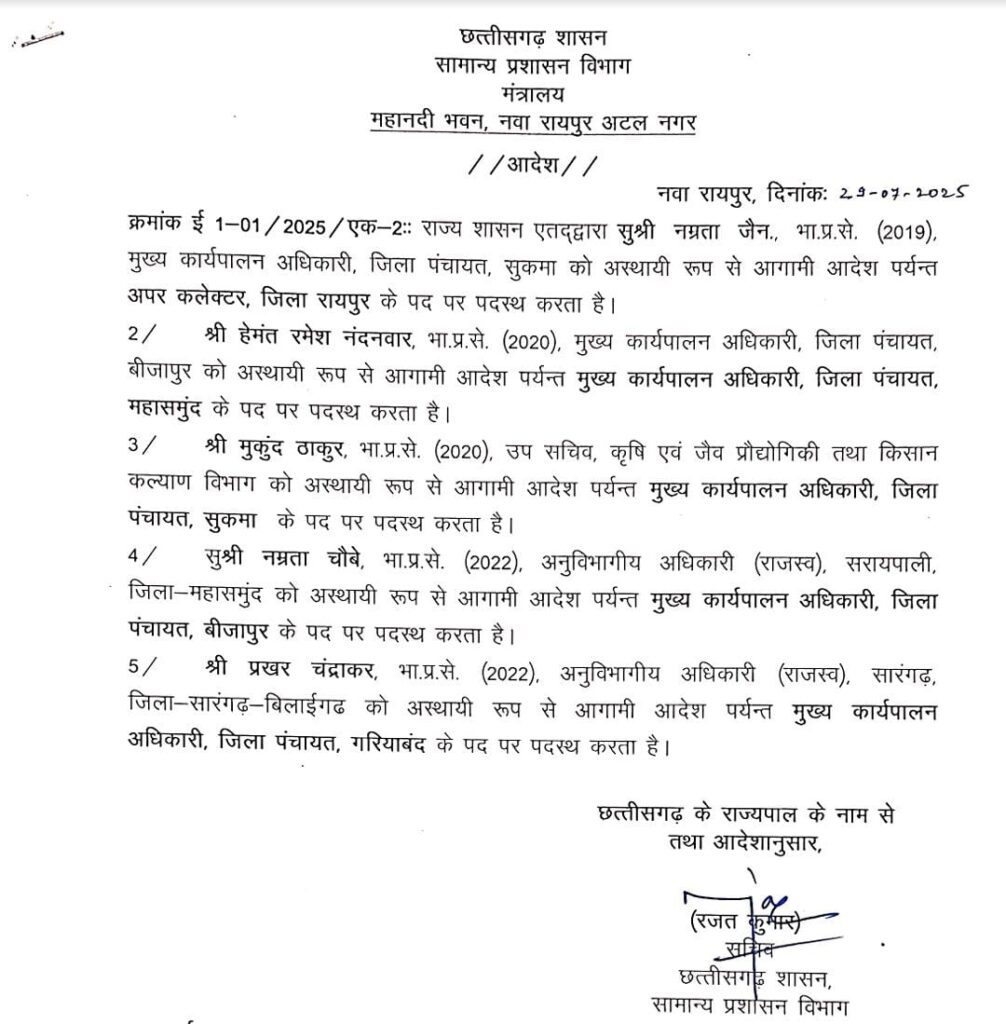 छत्तीसगढ़ शासन ने मंगलवार को बड़ा प्रशासनिक फेरबदल करते हुए पाँच IAS अधिकारियों के तबादले किए हैं।