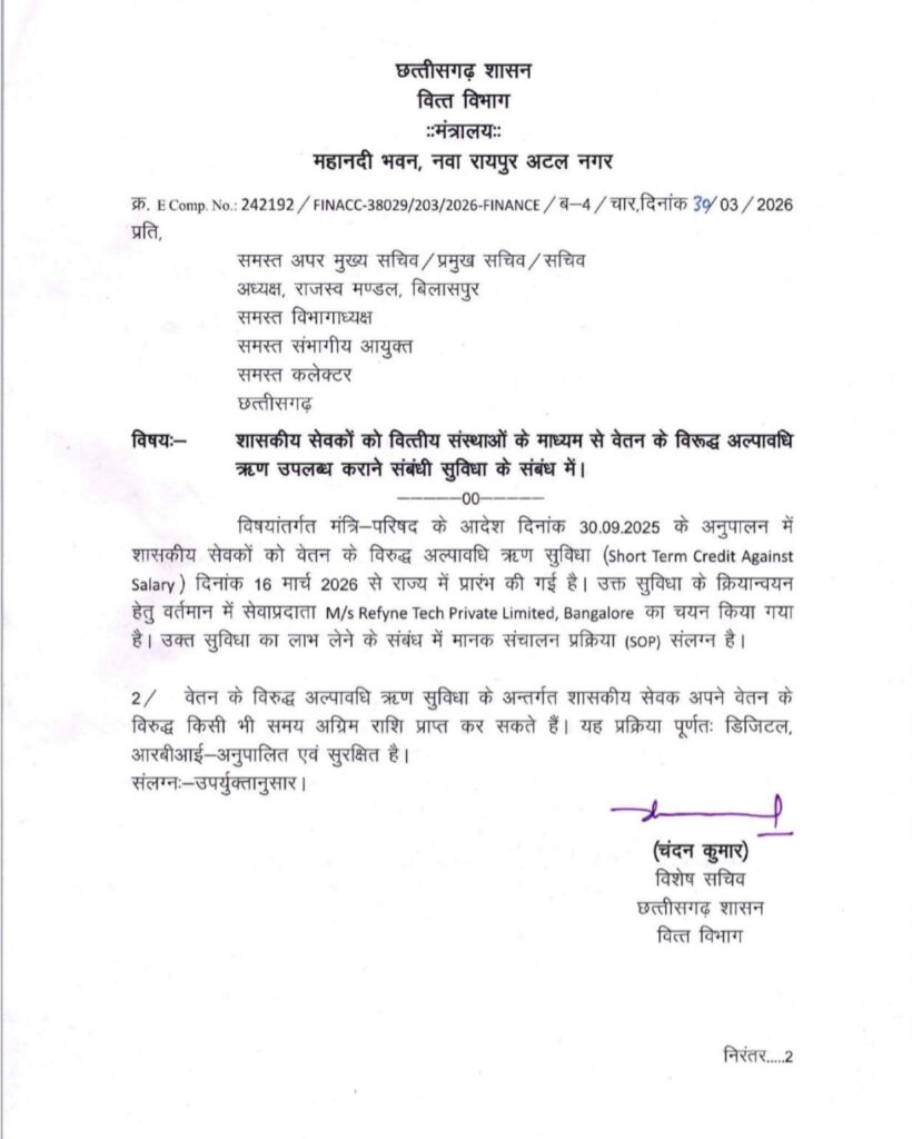 छत्तीसगढ़ के शासकीय कर्मचारियों को बड़ी राहत, अब वेतन के विरुद्ध मिलेगा शॉर्ट टर्म लोन, वित्त विभाग ने जारी किया आदेश…