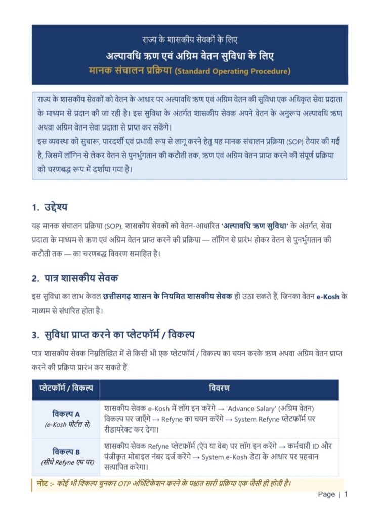 वित्त विभाग ने इस योजना के क्रियान्वयन के लिए बैंगलोर की M/s रिफाइन टेक प्राइवेट लिमिटेड (M/s Refyne Tech Private Limited,Bangalore) को सेवा प्रदाता के रूप में चयनित किया है। कर्मचारियों को इस सुविधा का लाभ लेने के लिए मानक संचालन प्रक्रिया (SOP) भी जारी की गई है, जिसमें आवेदन से लेकर राशि प्राप्त करने तक की पूरी प्रक्रिया स्पष्ट की गई है।