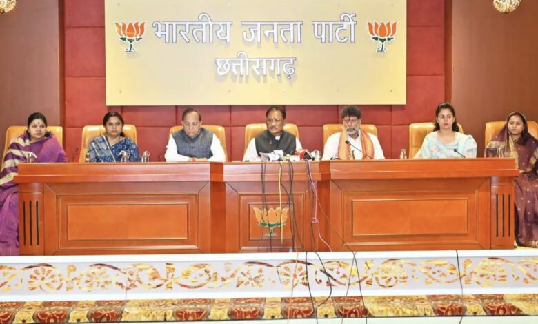 मुख्यमंत्री विष्णु देव साय ने बीजेपी के राष्ट्रीय महामंत्री अरुण सिंह, बीजेपी प्रदेश अध्यक्ष किरण सिंहदेव, मंत्री लक्ष्मी राजवाड़े, रायपुर महापौर मीनल चौबे, सांसद कमलेश जांगड़े, सांसद लक्ष्मी वर्मा के साथ नारी शक्ति वंदन अधिनियम के लोकसभा में पारित नहीं हो पाने पर प्रेस वार्ता के जरिए भाजपा का पक्ष रखा.