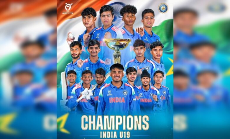 हरारे। भारतीय टीम ने 6वीं बार अंडर-19 वर्ल्ड कप की ट्रॉफी पर कब्जा कर लिया है. फाइनल मुकाबले में भारत ने 100 रनों से इंग्लैंड को करारी शिकस्त दी है. इस जीत में वैभव सूर्यवंशी की 80 गेंदों में 175 रनों की पारी का अहम योगदान रहा. कप्तान आयुष म्हात्रे ने भी 53 रन की शानदार पारी खेली. वहीं भारत के लिए आरएस अंबरीश ने महत्वपूर्ण 3 विकेट झटके.