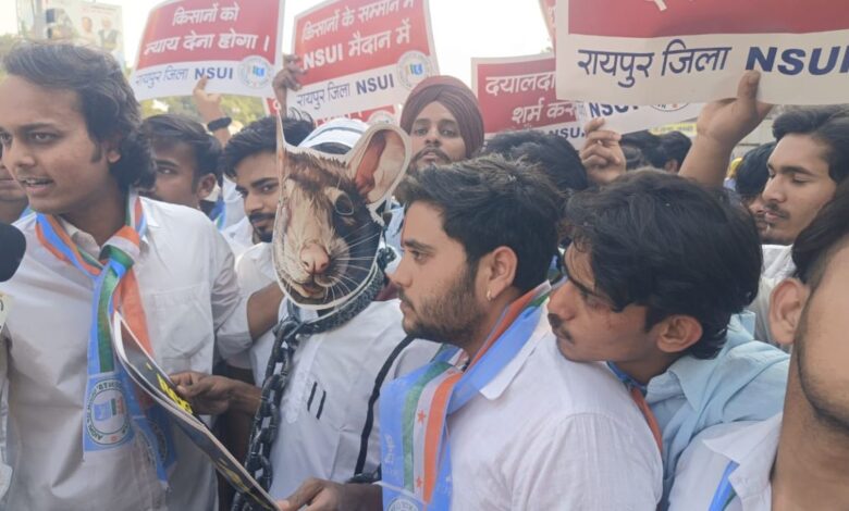 धान घोटाले के विरोध में NSUI का अनोखा प्रदर्शन, चूहे का वेश धारण कर कलेक्ट्रेट पहुंचे कार्यकर्ता