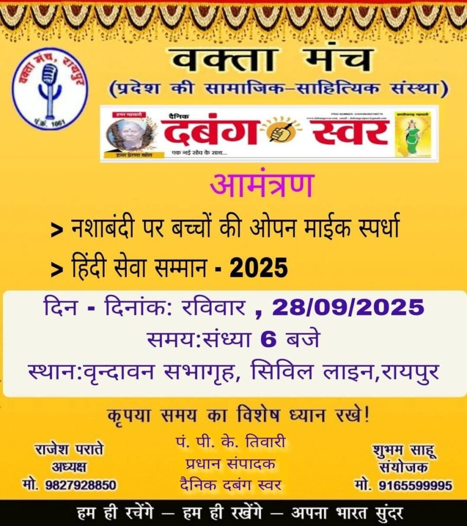 वक्ता मंच के अध्यक्ष राजेश पराते ने कहा कि विभिन्न क्षेत्रों की प्रतिभाओं को प्रोत्साहित करने एवं नशा मुक्त समाज के निर्माण के उद्देश्य से दबंग स्वर के साथ पूरे वर्ष कई कार्यक्रमों की रूपरेखा बनाई गई है। उन्होंने समस्त प्रबुद्धजनों को 28 सितम्बर के आयोजन में शामिल होने का आमंत्रण दिया।