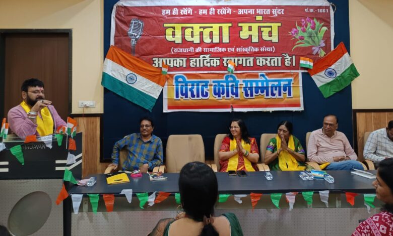 रायपुर। राजधानी स्थित वृन्दावन सभागृह में आज वक्ता मंच द्वारा देशभक्ति से ओतप्रोत काव्य गोष्ठी का आयोजन किया गया। यह आयोजन गणेशोत्सव की ऐतिहासिक परंपरा को पुनर्जीवित करने के उद्देश्य से किया गया। ज्ञातव्य है कि लोकमान्य बाल गंगाधर तिलक ने स्वतंत्रता आंदोलन के दौरान सार्वजनिक गणेशोत्सवों के मंच का उपयोग सांस्कृतिक और साहित्यिक कार्यक्रमों के माध्यम से देशभक्ति की भावना जागृत करने के लिए किया था।