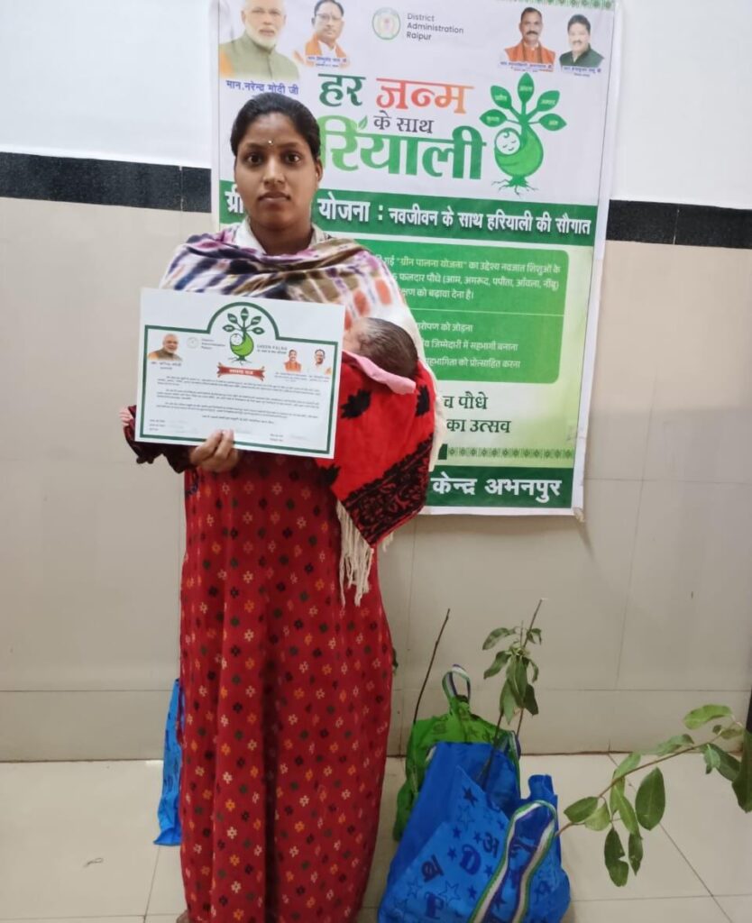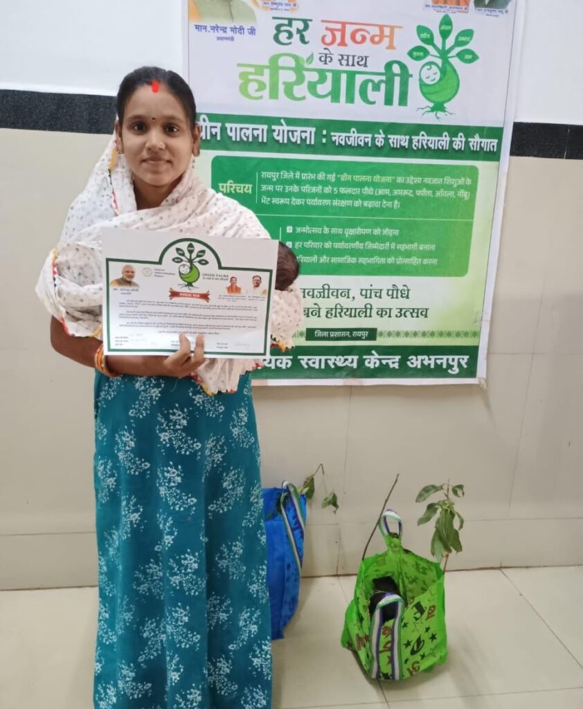 रायपुर। मुख्यमंत्री विष्णुदेव साय की पर्यावरण संरक्षण हेतु प्रतिबद्धता के अनुरूप रायपुर जिला प्रशासन द्वारा “प्रोजेक्ट ग्रीन पालना” अभियान को प्रभावशाली ढंग से आगे बढ़ाया जा रहा है। इस अभिनव पहल के तहत शासकीय अस्पतालों में प्रसव उपरांत माताओं को फलदार पौधे भेंट स्वरूप दिए जा रहे हैं, ताकि एक नई ज़िंदगी के आगमन के साथ एक नया वृक्ष भी धरती पर जन्म ले।