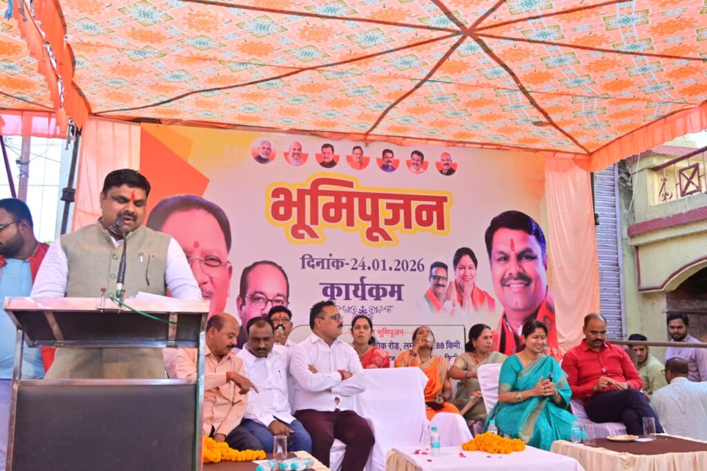 दुर्ग। दुर्ग नगर निगम क्षेत्र के वार्ड क्रमांक 44 में आज विभिन्न विकास कार्यों के भूमिपूजन कार्यक्रम का आयोजन किया गया, जिसमें स्कूल शिक्षा मंत्री गजेंद्र यादव मुख्य अतिथि के रूप में शामिल हुए। उन्होंने वार्ड में प्रस्तावित सड़क निर्माण एवं सामुदायिक भवन सहित अन्य कार्यों का विधिवत भूमिपूजन किया। यह कार्यक्रम दुर्ग को अधिक विकसित, सुदृढ़ एवं नागरिकों के लिए सुगम बनाने की दिशा में एक महत्वपूर्ण पहल के रूप में देखा जा सकता है। कार्यक्रम के दौरान दुर्ग विधानसभा क्षेत्र में कुल ₹115.76 लाख की लागत से तीन प्रमुख डामरीकरण सड़क निर्माण कार्यों की भूपिपूजन किया गया। इनमें ईरानी डेरा से महाराजा चौक तक 1.88 किलोमीटर, दुर्ग टेम्पो स्टैंड से पोटिया रोड तक 3 किलोमीटर तथा पोलिटेक्निक कॉलेज परिसर में 1.20 किलोमीटर लंबी सड़क का निर्माण शामिल है। इसके अतिरिक्त वार्ड में ₹19.30 लाख की लागत से सतनाम भवन तथा ₹9.94 लाख की लागत से सतनाम भवन में अहाता निर्माण का भी भूमिपूजन किया गया। साथ ही नागरिकों की लंबे समय से प्रतीक्षित मांग सामुदायिक भवन के निर्माण कार्य का भी शुभारंभ किया गया।