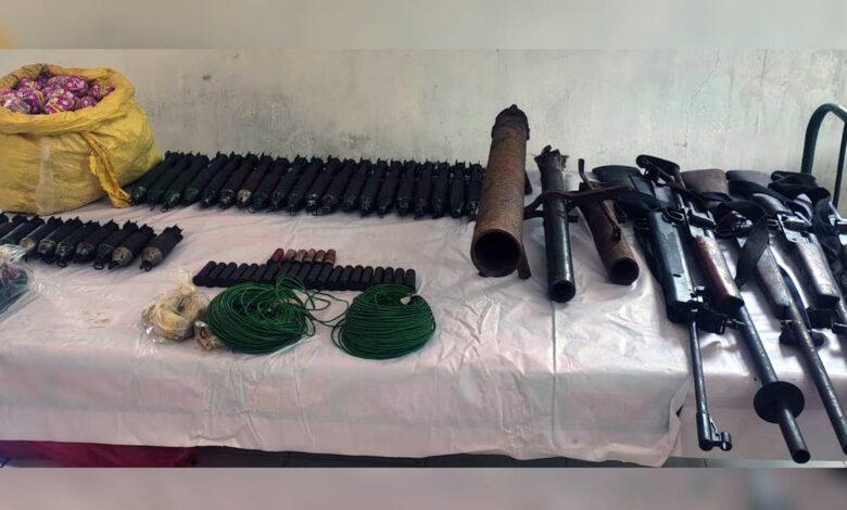 बीजीएल लांचर-2, 12 बोर- 2, एयरगन- 1, डायरेक्शन आईईडी-3, टिफिन आईईडी लगभग 5 किग्रा-1, बीजीएल बम-30, 12 बोर राउण्ड -26, बारुद प्लास्टिक पैकेट मे लगभग 2 किग्रा, मल्टी मीटर-1, पटाखा-12 पैकेट, बिजली वायर-2 बंडल, पोच-2, स्पिलंटर – 1 पैकेट।