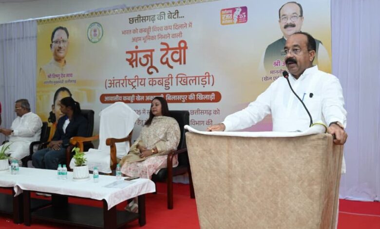 रायपुर। भारत को कबड्डी विश्वकप और एशियन चैंपियनशिप दिलाने में अहम भूमिका निभाने वाली संजू देवी को राज्य शासन के खेल एवं युवा कल्याण विभाग द्वारा 50 लाख रुपए की प्रोत्साहन राशि प्रदान की गई है। छत्तीसगढ़ में पहली बार किसी खिलाड़ी को इतनी बड़ी प्रोत्साहन राशि दी गई है। उप मुख्यमंत्री तथा खेल एवं युवा कल्याण मंत्री अरुण साव ने आज नवा रायपुर स्थित अपने निवास कार्यालय में आयोजित सम्मान समारोह में उन्हें यह राशि सौंपी। श्री साव ने इस दौरान बिलासपुर के चिंगराजपारा कबड्डी क्लब को कबड्डी मैट भी प्रदान किया।