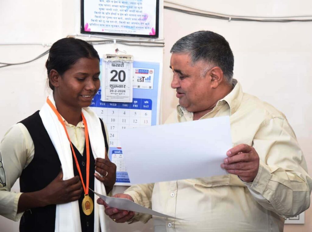 पर्यटन मंत्री राजेश अग्रवाल ने हैमर थ्रो में राज्य स्तर पर तृतीय स्थान प्राप्त करने वाली छात्रा सुधा सिंह को किया सम्मानित